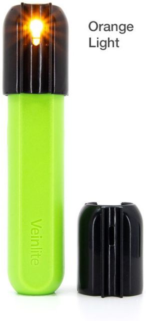 片手で操作できるポータブル設計で、色の切り替え(緑:動脈/オレンジ:静脈/白:検査)と明るさ調整を一体化。1本のAAA電池(単4形電池)で動作し、コンパクトで持ち運びやすく、キャップにストラップも装着可能です。