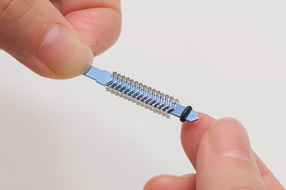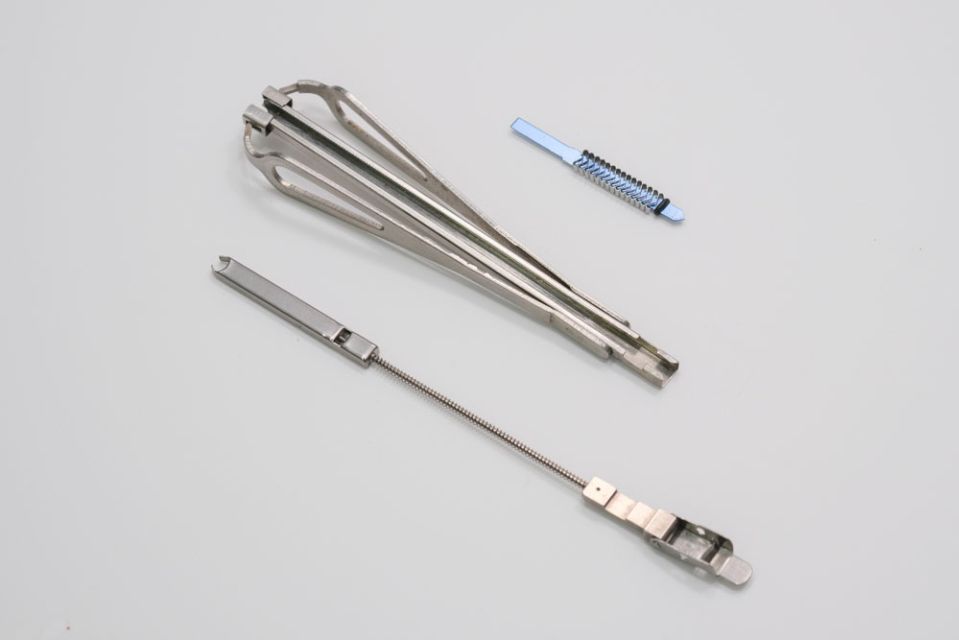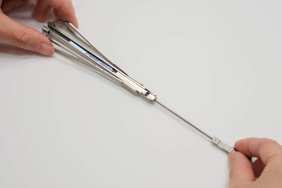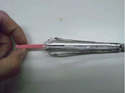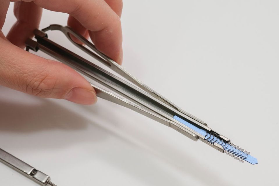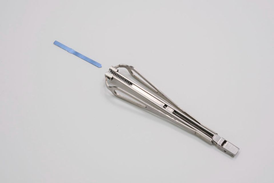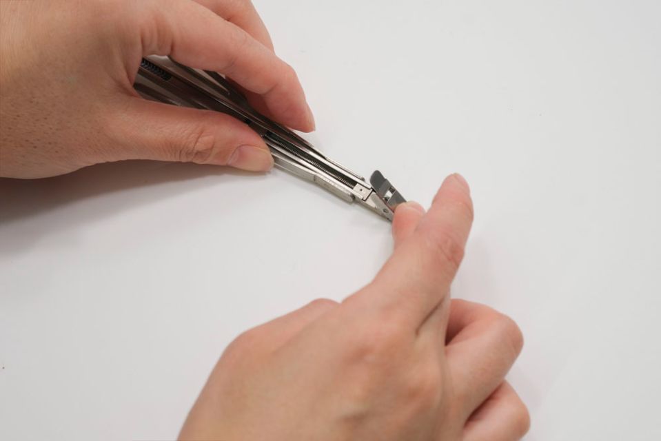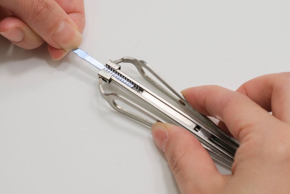 ホッチキスの要領でとても簡単に縫合ができます。ステンレス製のアプライヤーにクリップ入りのラックを装填し、切開部に打針します。アプライヤーのスプリング効果でクリップの打ち込みが楽に行えます。