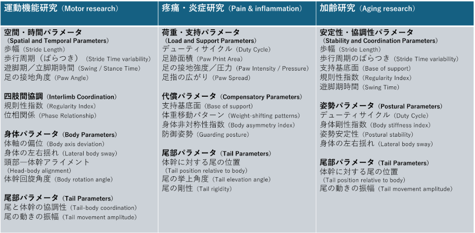 歩行の変化(ストライド長、スタンス時間、協調性など)は病態の進行・治療効果の指標として非常に有用です。